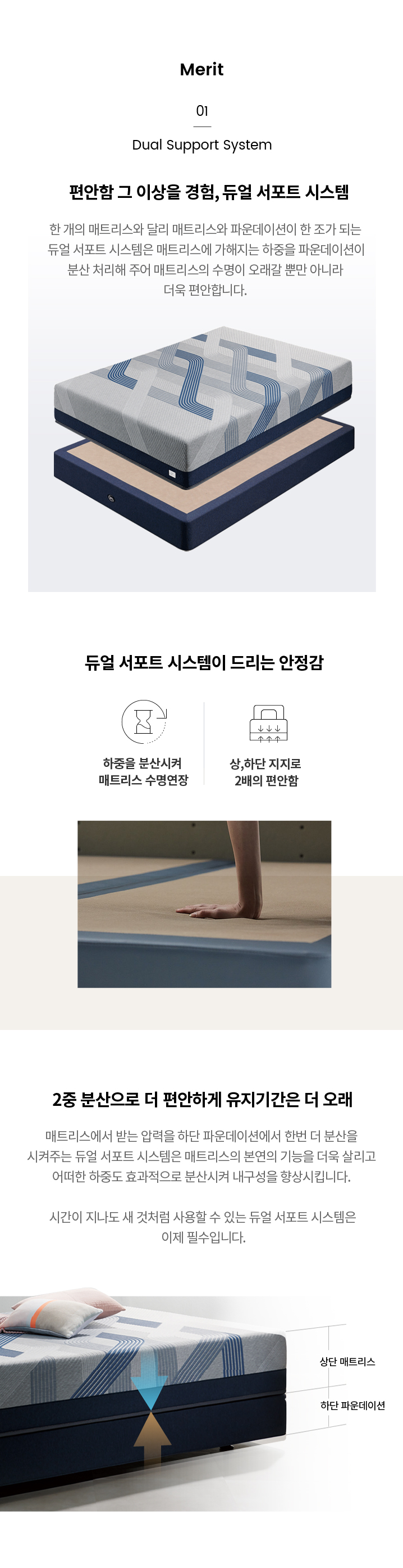매트리스에서 받는 압력을 하단 파운데이션에서 한번 더 분산 시켜주는 듀얼 서포트 시스템은 매트리스의 본연의 기능을 더욱 살리고 어떠한 하중도 효과적으로 분산시켜 내구성을 향상시킵니다.